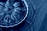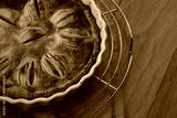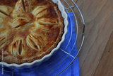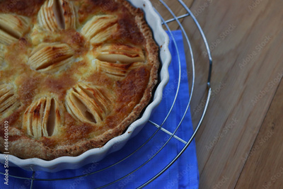 Top view of tasty apple pie with cream and sliced fruits on wooden table