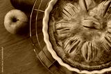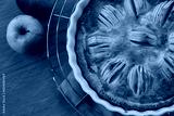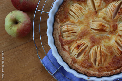 Top view of tasty apple pie with cream, sliced fruits and two apples on wooden table