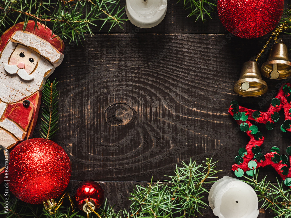 Merry Christmas. Happy New Year. Beautiful greeting card and place for congratulatory inscriptions. Close-up, view from above. Congratulations for loved ones, relatives, friends, colleagues