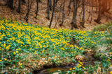 Fantastic carpet of yellow marsh marigold (Caltha palustris) glowing by sunlight. Location place Carpathian, Ukraine, Europe. Beauty world.