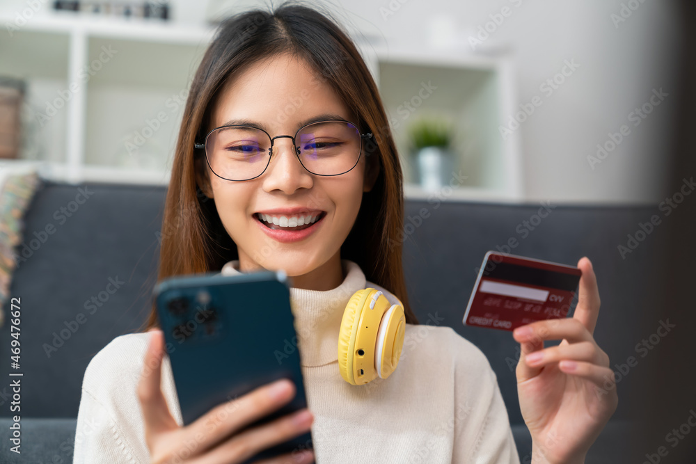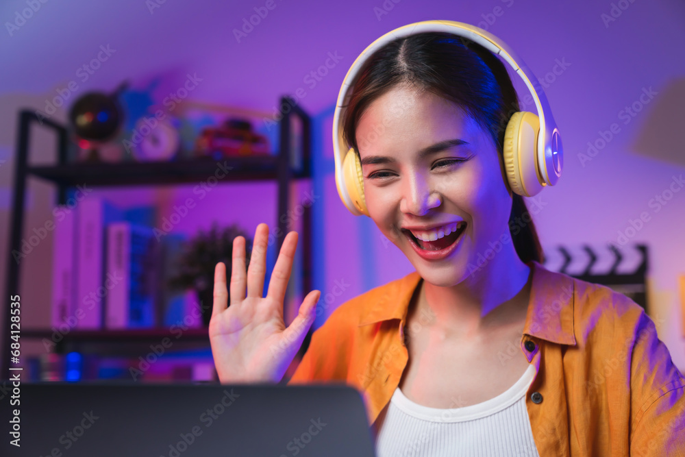Cheerful beautiful Asian woman wearing headphones and look to laptop at video calling meeting online on the Internet.