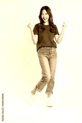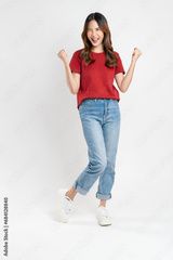 Happy smiling young woman wearing red t-shirt with raises arms and fists clenched with shows strong powerful, celebrating victory expressing success.
