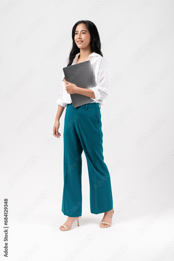 Cheerful beautiful Asian business woman holding laptop and looking forward on white background.