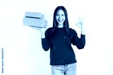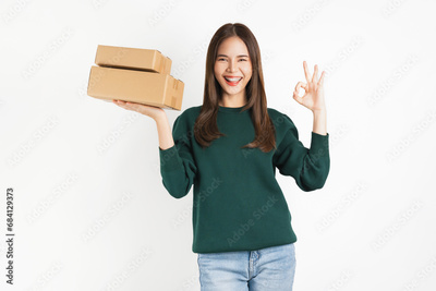 Smiling beautiful Asian woman holding cardboard boxes and shows ok sign on white background. Concept delivery online.