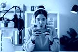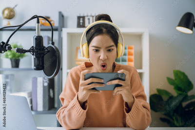 Excited Young Asian woman wearing headset and playing online game on smartphone with live broadcasting on internet.