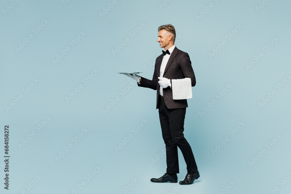 Full body sideways adult barista male waiter butler man wearing shirt black suit bow tie uniform holding metal tray plate go work at cafe isolated on plain blue background Restaurant employee concept.