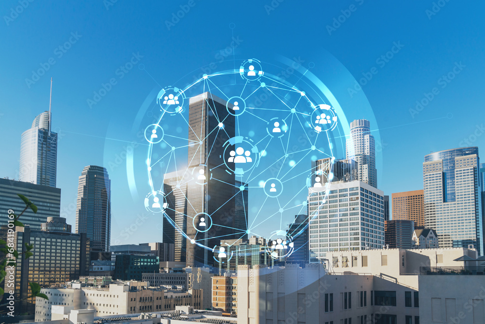 Panorama cityscape of Los Angeles downtown at day time, California, USA. Skyscrapers of LA city. Glowing Social media icons. The concept of networking and establishing new connections between people