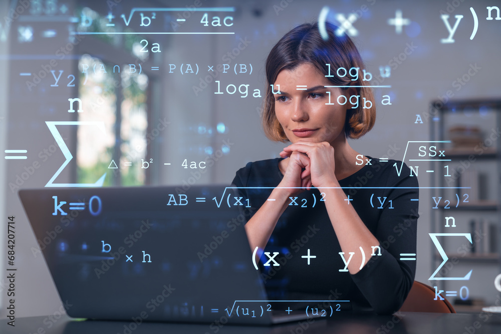Pensive attractive beautiful businesswoman in studying on laptop at university library in background. Concept of distant business education, internet surfing, information technology.