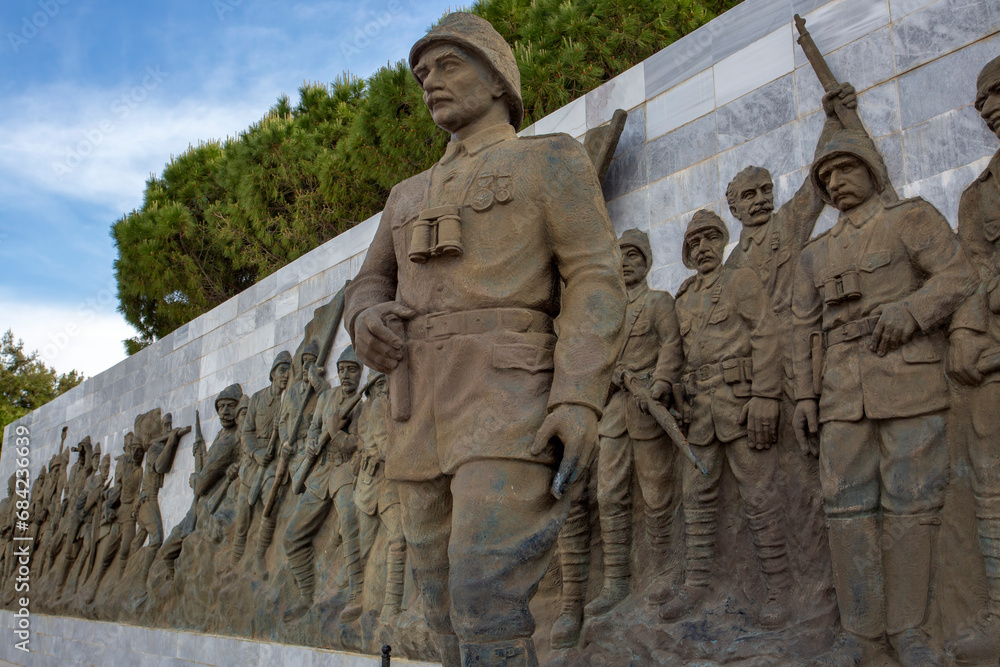 Canakkale, Turkey / May 26, 2019: Mustafa Kemal Ataturk and Turkish Army Statues in The Canakkale Martyrs Memorial.