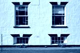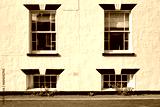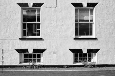 Monochrome view of a large terraced house showing the sub basement windows seen at pavement level. Used as. holiday let on the Suffolk, UK coast.