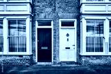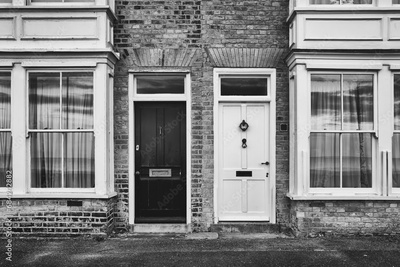 Matt monochrome view of a pair of wooden from doors seen on brick built terraced houses overlooking a seaside position in the UK. The seaside reflection can just be seen in the bay windows.