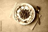 Turkish Manti with Yogurt, Minced Meat and Fried Butter Sauce From Artvin called Silor - Siron - Ziron Rolled Raw Dough and Fried Phyllo -Manlama with Dill