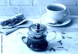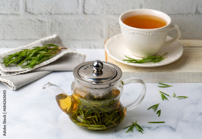 Cup of healthy rosemary tea with fresh rosemary bunch on rustic background, winter herbal hot drink concept, salvia rosmarinus