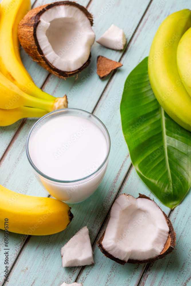 Banana coconut fresh cocktail; delicious milkshake, coconut milk or coconut water