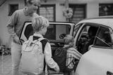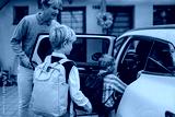 Children getting into the car, father taking them to school and kindergarten before going to work.