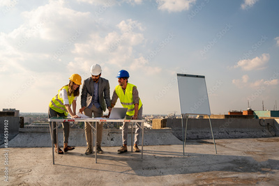 Team of architects people in group on construciton site check documents and business workflow