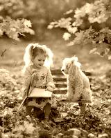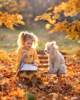 Little girl child and dog in autumn forest. Female kid and pet portrait at nature with yellow autumn leaves in park during fall outdoor.