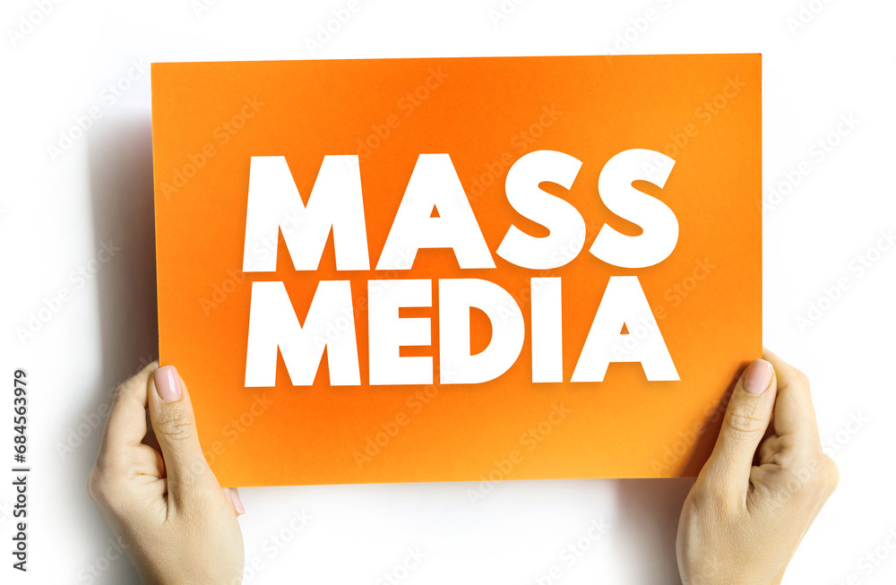 Mass Media refers to a diverse array of media technologies that reach a large audience via mass communication, text concept on card for presentations and reports