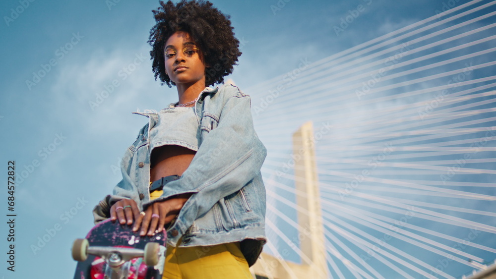 Trendy girl skateboarder looking camera at blue sky. African teenager posing