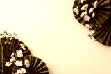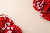 Let the spirit of Chinese New Year inspire you with this visually stunning arrangement. Top view of red fans and symbolic elements like sakura against a neutral backdrop, creating a festive atmosphere