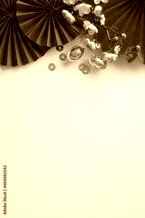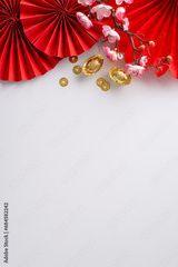 Commemorate Chinese New Year with this top view vertical scene showcasing red fans, feng shui items, ancient coins, sycee, sakura blossom on white background with ample space for text