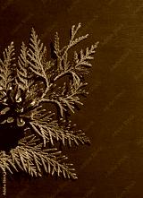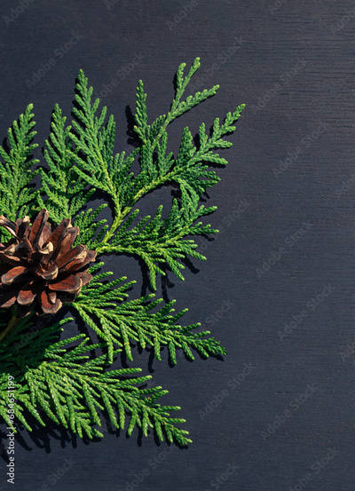 Christmas celebration concept with pine cone and thuja branch on dark blue wooden background. Copy space