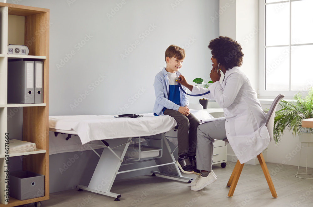 Friendly doctor doing medical checkup of child patient. Young African American woman pediatrician in white coat puts stethoscope to chest of happy little boy and listens to his heart or lungs sounds