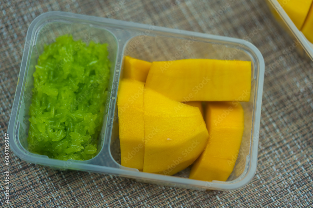 Mango sticky rice pandan or mango with pandan sticky rice, Thai dessert.