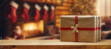 Desk of free space and winter landscape. Christmas gifts and empty space.