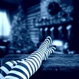 Woman legs on table with christmas gifts and home interior with fireplace. Board of empty space with december time.