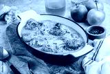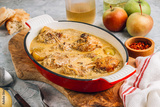 Chicken Normandy served in an enamel-coated cast-iron roaster