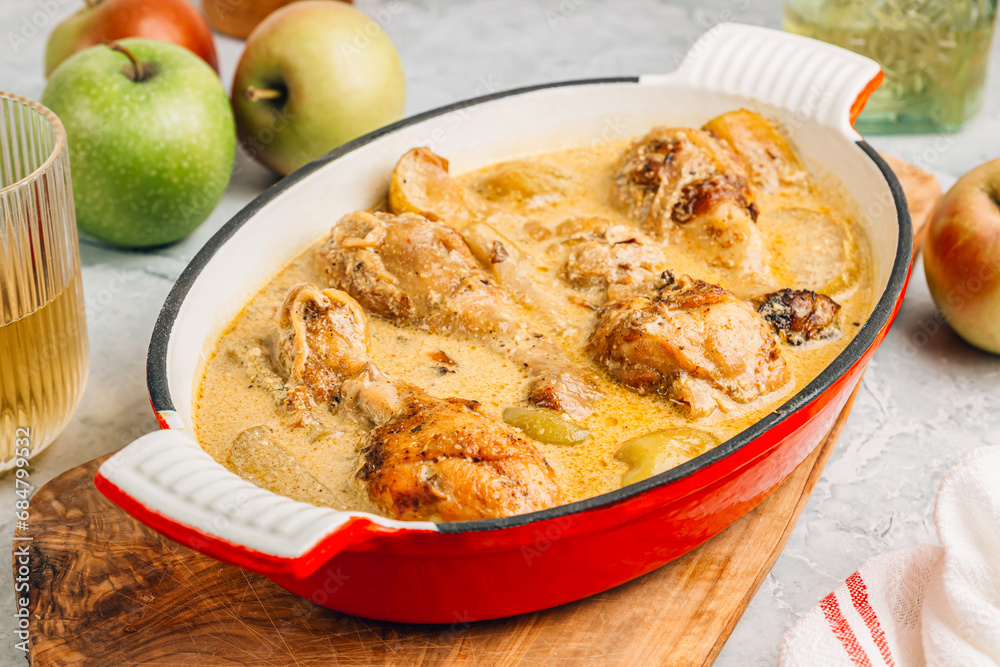Chicken Normandy served in an enamel-coated cast-iron roaster