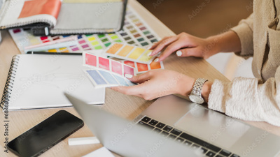 Close up Creative fashion designer atelier sketching on drawing book in studio.