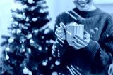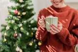 Closeup female hands holding cup of hot cocoa with marshmallow topping.