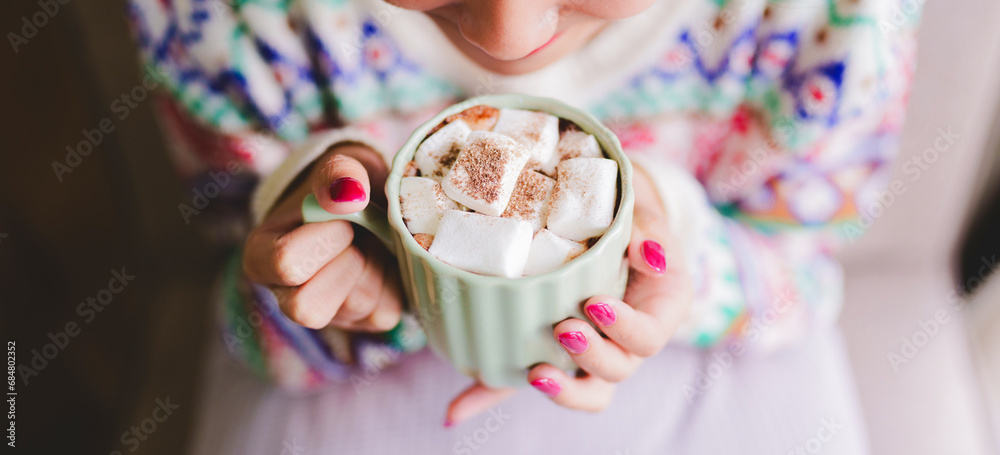 Closeup female hands holding cup of hot cocoa with marshmallow topping.