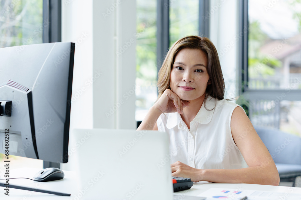 Portrait of middle age asian developer sitting on desk at contemporary office.