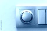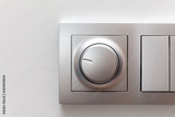 Modern smart rotary knob light dimmer light switch mounted on a wall, front view, frontal shot, object detail closeup. Dimming lights round button, circle, smart home lighting controls simple concept