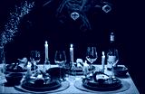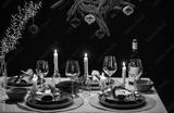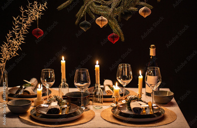 winter holidays, dinner party and celebration concept - scandinavian christmas table serving with burning candles at home at night