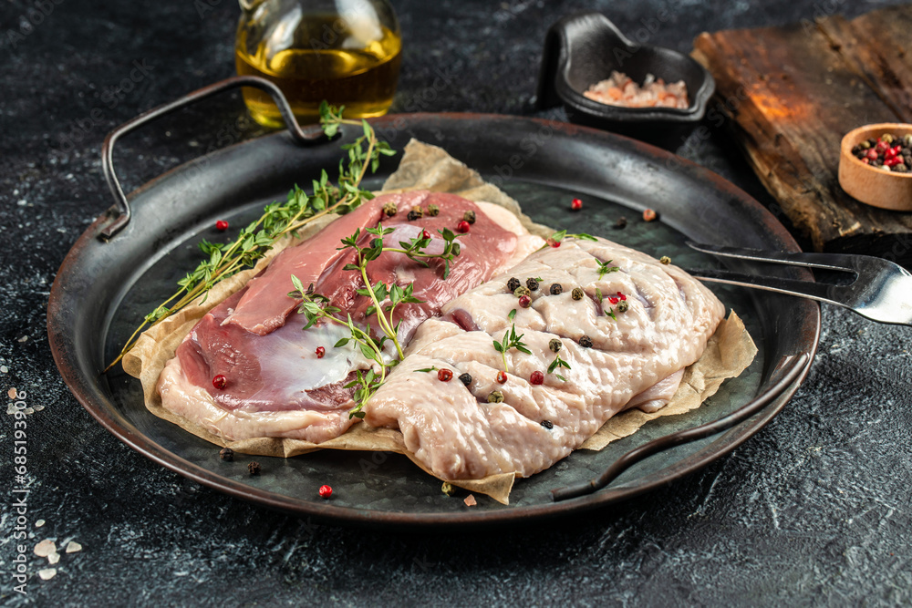 Fresh duck meat, raw breast steak on a dark background. Food recipe background. Close up
