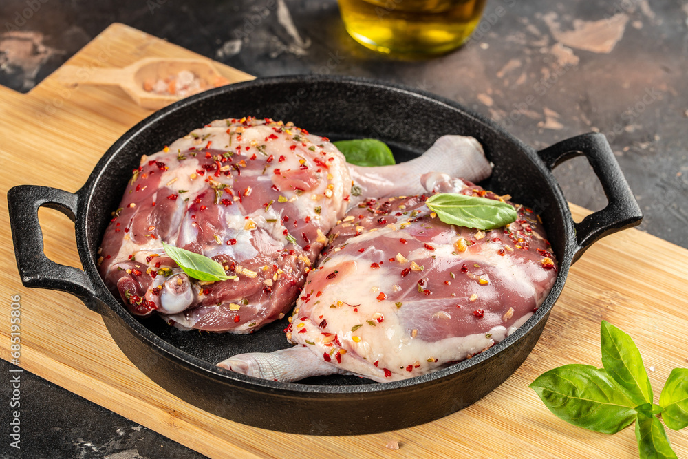 raw Duck legs on plate on a light background top view. copy space