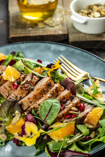 duck breast fried and salad leaves on plate. Food recipe background. Close up