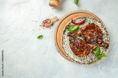 Roasted duck legs. Delicious and healthy food on a light background top view. copy space