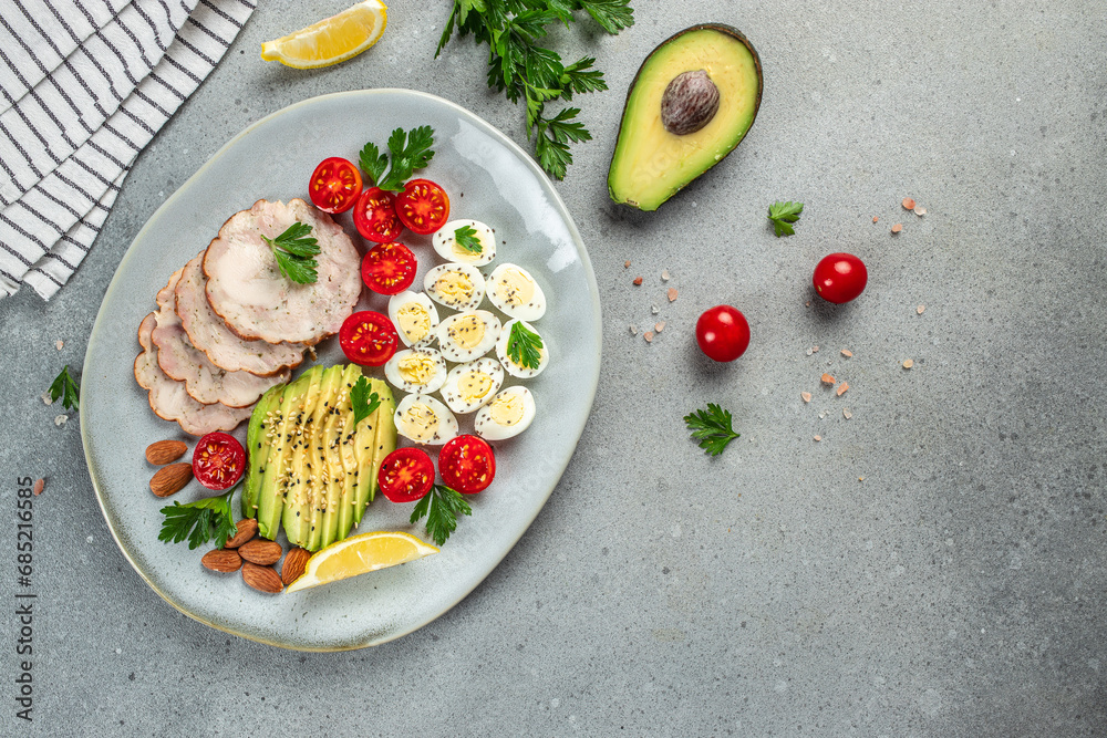 Chicken fillet with salad. Buddha Bowl. Healthy food, keto diet, Healthy fats, clean eating for weight loss, banner, menu, recipe place for text, top view