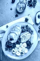 Delicious breakfast avocado, eggs, chicken fillet and cherry tomatoes. Keto diet concept. vertical image. top view
