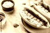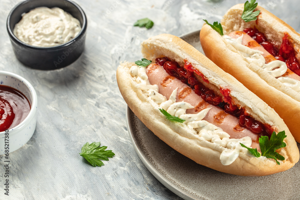 Hot dog grilled sausage in a bun with sauces. on a light background top view. copy space