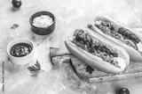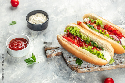 Delicious homemade hot dogs. Menu, recipe mock up, banner. copy space for text. top view