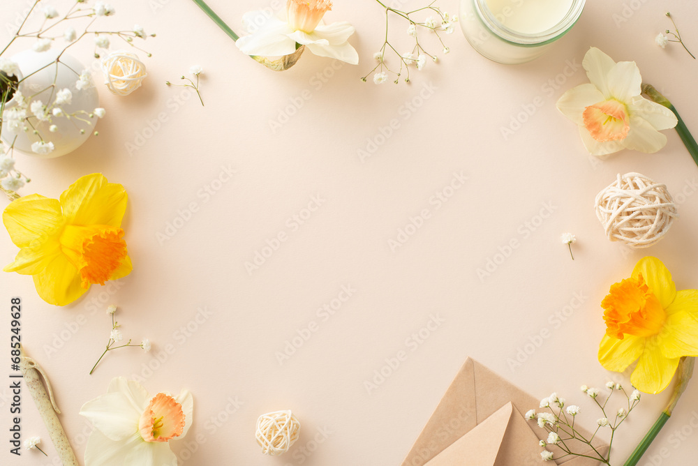 Extend your warmest wishes for spring with narcissus and gypsophila. Top view image captures flowers, an envelope and candle on a beige isolated backdrop creating an inviting space for adverts or text
