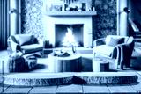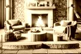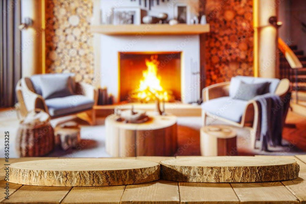 Wooden board with pedestal and free space for your decoration. Home interior and fireplace. Magic christmas time. Warm light. Empty space for your decoration.