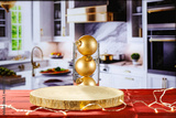 Desk of free space and kitchen interior. Chrismtas time and pedestal for your decoration.