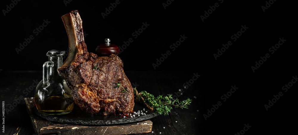 Grilled Tomahawk Steak on the bone. Long banner format. copy space for text
